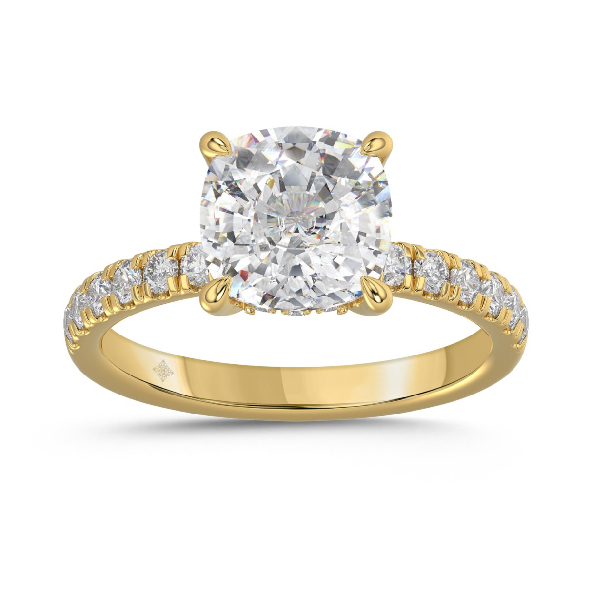 14K YELLOW GOLD 3 1/2CT ROUND/CUSHION DIAMOND LADIES RING (CENTER STONE CUSHION DIAMOND 3CT)