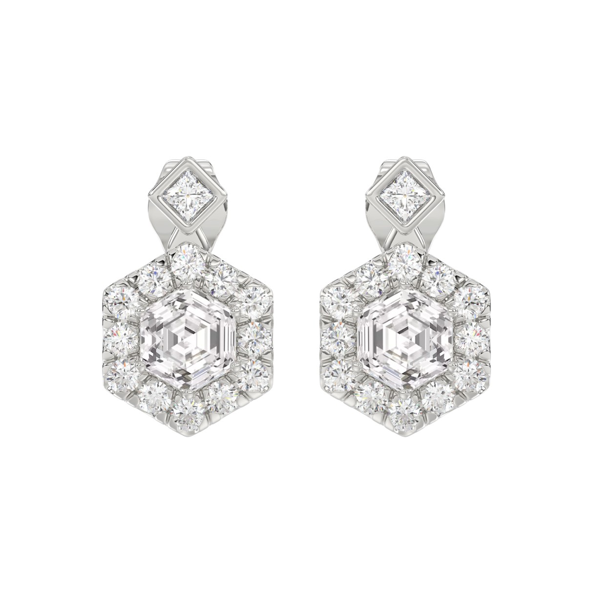 14KWHITE GOLD 2 1/4CT ROUND/HEXAGON STEP CUT DIAMOND LADIES EARRINGS